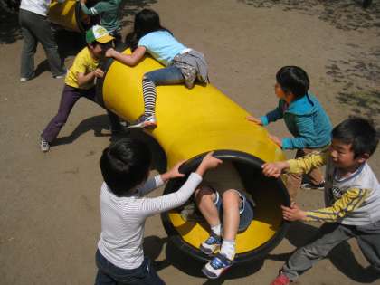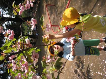 お昼とおやつを食べ終わると、楽しみにしていた遊びの時間です。桜の花をブーケにしたり、世田谷小学校にはない、滑り台やシーソー、チューブの遊具等をおおいに楽しむことができました。
