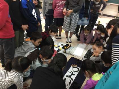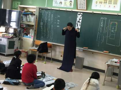 3年生の書写の時間にゲストティーチャーに来ていただきました。尊敬する書道家の先生です。