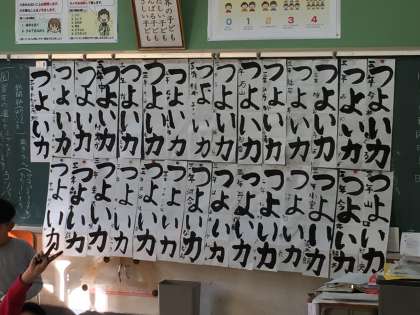 先生の指導を真剣に聴く子どもたち。文字通り「つよい力」が伝わってくるいい字です。