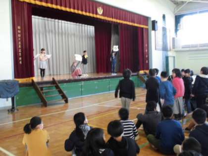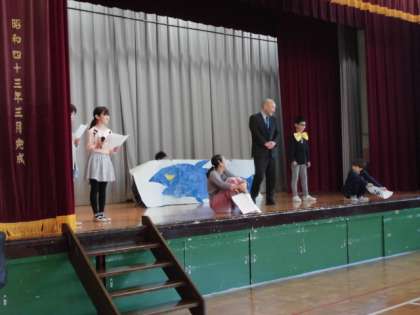 今朝の児童集会は「ウソ・ホント」クイズです。集会委員が出題する先生方や世田谷小にまつわるクイズが「うそ」か「本当」かを考えます。