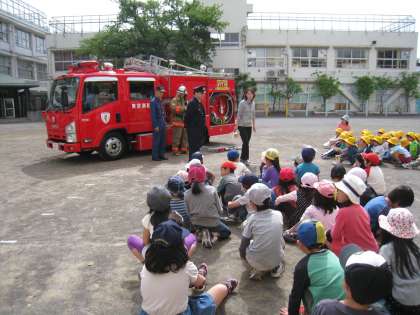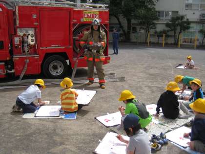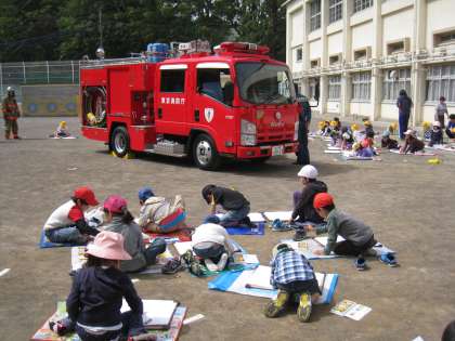 5月2日<月>1・2時間目に世田谷消防署宮坂出張所の所員の方に来て頂き、『働く消防写生会』が開かれました。参加は仲よし学級の1・2・5・6年生と1・2年生でした。