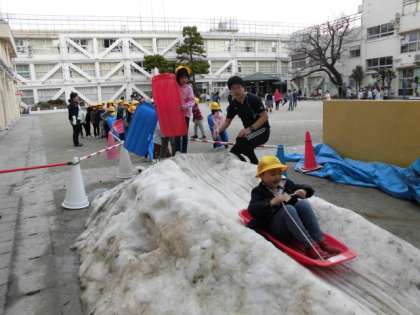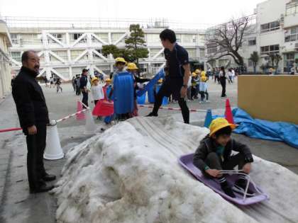 日曜日にいぶきの皆さんに作っていただいた雪のすべり台で、1年生と仲よし学級の子どもたちが遊びました。