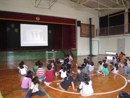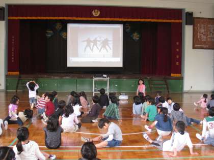 連休の合間の6日(金)1・2年生は、運動会の表現運動『みんなで作ろう”わ”』の練習を始めました。写真はそのリズムの様子を映像で確認しているところです。