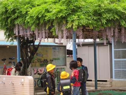 新学期、子供たちをむかえてくれた桜はすっかり葉桜になってしまいましたが、校門脇の藤棚は藤の花が満開です。