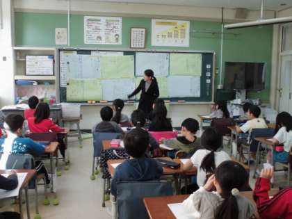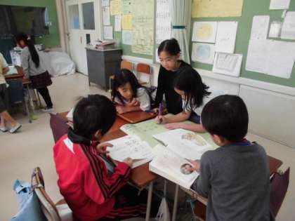 まず、教科ごとに今までどんなことを勉強したのかを思い出しました。「国語」について思い出していた子どもたちは、教科書を見ながら「この勉強楽しかった!」など友達と語り合い、学習内容を模造紙にどんどん書き出していました。