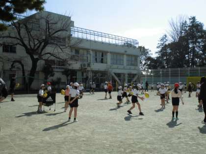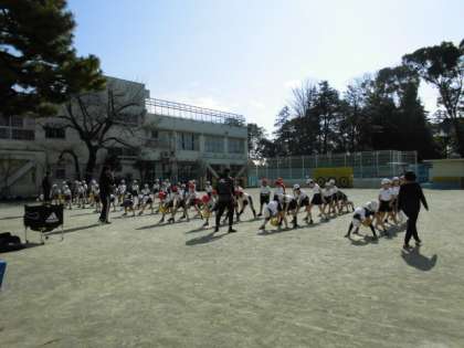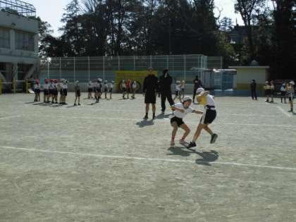 リコーブラックラムズの選手が来校し、ラグビーボールを使ったパス練習や、タグラグビーを教わりました。