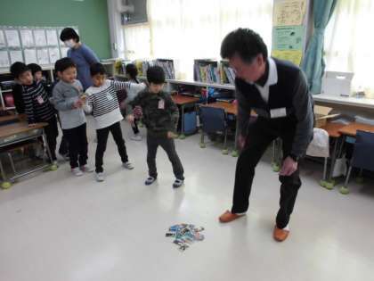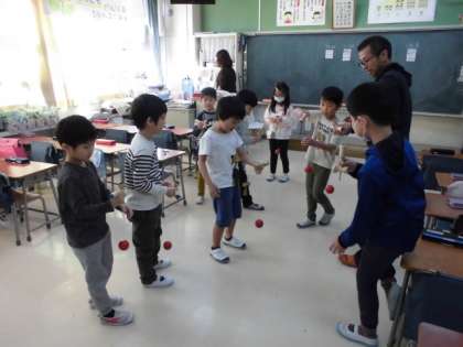 「昔遊び」(ベーゴマ、お手玉、めんこ、けん玉、ゴム跳び)の達人の皆さんが来校し、1年生に「達人のワザ」を教えてくれました。