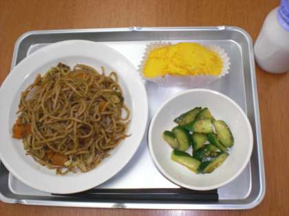 今日の給食は、ソース焼きそば・牛乳・きゅうりの中華味・キャロットケーキです。