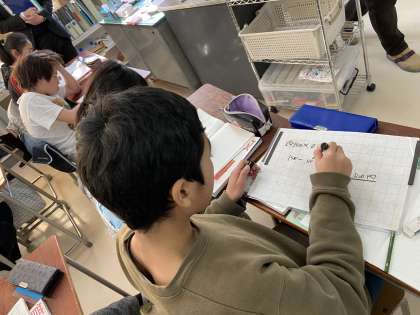 秋田県大館市の教育専門監の方をお招きして行う世田谷区としての研修会はなくなりましたが、校内の先生たちだけで研修授業を行いました。担当した先生が提案して実現しました。当日予定されていた指導案で子どもたち一人ひとりがよく考え、解き方や考え方を提案し合うよい授業でした。反応ワードも身についてきました。子どもたちの前向きに真剣に考える表情がとてもすてきでした。授業後は教育専門監の方の授業のDVDを見て研修しました。