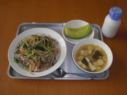 今日の給食は、ビビンバ・牛乳・わかめスープ・メロン(アンデスメロン)です。