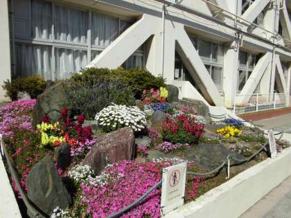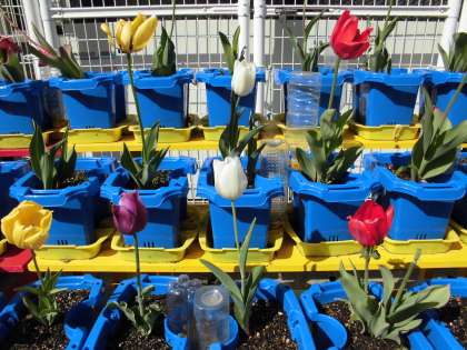 2年生が1年生のころにうえたチューリップは、赤白きいろ・・・いろとりどりのきれいな花をさかせています。しょくいんしつまえにしゅじさんがうえてくださった花もとてもきれいですよ。
