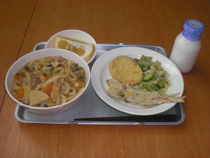 今日の給食は、煮込みうどん・牛乳・てんぷら(さつまいも・ししゃも)野菜のゆかりかけ・美生柑です。