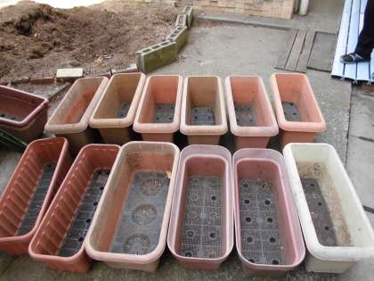 2.ぜんぶで 24こ! それに ひりょうをまぜた 土を入れました。