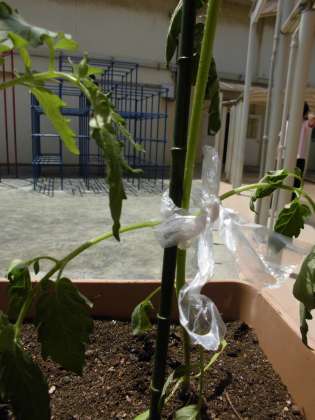 6.さいごに なえと いっしょにとうめいのひもで くくりつけている ぼう、(「しちゅう」といいます) すべてのなえに くくりつけました。 なぜこのようなものを つけたのか わかりますか。まん中のしゃしんを見たら なぜつけたのか わかるかもしれませんね。 また、あさがおのときにも おなじようなことをやりましたね! こたえは 学校にきてから みなさんでたしかめましょう。(どのれつに なんのやさいがうえられているかも たしかめましょう。)