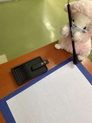 メイちゃんが書道に挑戦(ちょうせん)しています。今週の課題(かだい)では、「林」を書きます。半紙は、折れないように課題プリント集の中に、はさんであります。表紙のつぎのページを見てください。半紙は、1まいだけ提出(ていしゅつ)します。