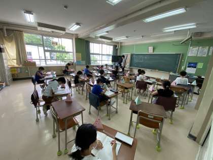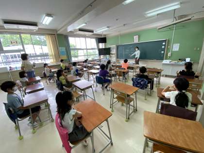 ちょっと緊張気味ですが、担任の先生の話をよく聞いています。