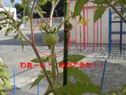 トマトに みができたのです!まだみどりいろですが、これから いろのへんかをかんさつしたいと思います。