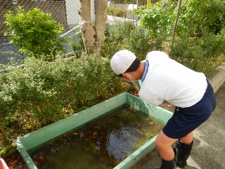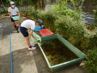 採ったヤゴは家庭科室のうらの大きな水槽にうつしました。