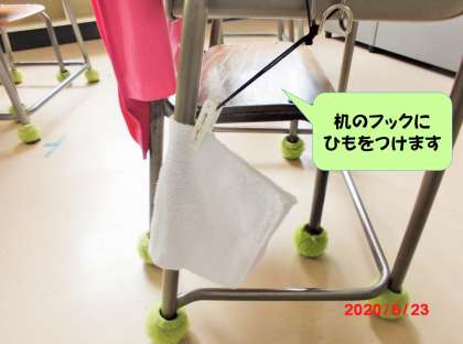 1年生は、来週から掃除が始まります。各自持ってきた雑巾は、上の写真のように自分の机に洗濯ばさみでつけます。そのため、洗濯ばさみ(1つ)に20cm〜30cmほどのひもをつけてくださるようお願いします。