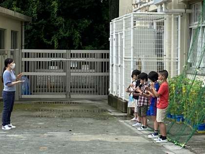 音楽室で音を出さずに吹き方を学んで、外に出て演奏しています。