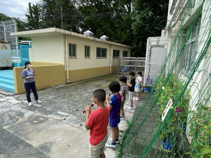 本当は全員でやりたいところですが、3蜜を避けてお互いの距離をとって外での器楽の学習です。