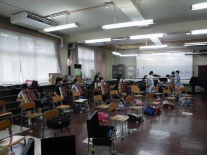 写真は、屋外スポーツクラブと屋内スポーツクラブが合同でしっぽ取りをしているところと、ミュージッククラブの練習風景です。