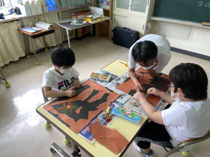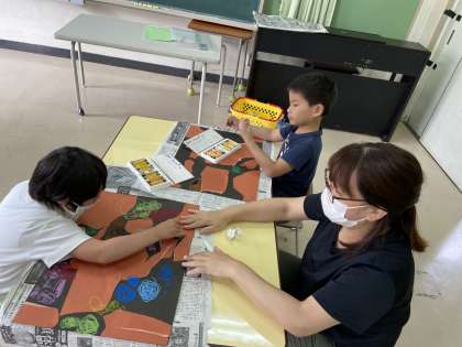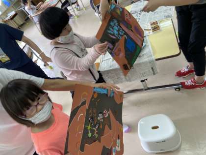 「これリンゴの木、お魚もいるよ。」「これはね、がいこつ」 仲よし学級1組 図工