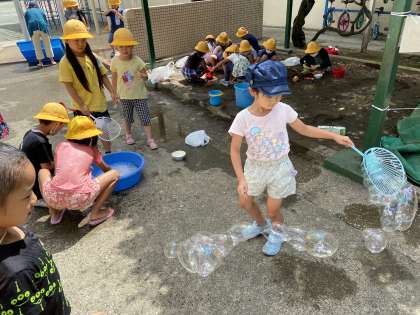 骨だけになったうちわでシャボン玉を作って楽しんでいました。その場でくるくると回るとたくさんのシャボン玉ができることに気付いたのです。