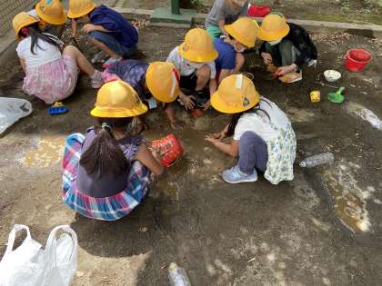 正門付近でシャボン玉や水鉄砲、泥遊びをしていました。