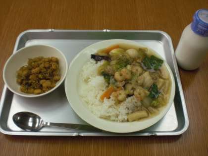 今日の給食は、中華丼・牛乳・大豆とじゃこの甘辛あげです。