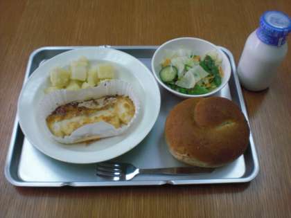 今日の給食は、セサミパン・牛乳・魚(ホキ)のチーズ焼き・粉ふきいも・アスパラガスのサラダです。
