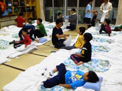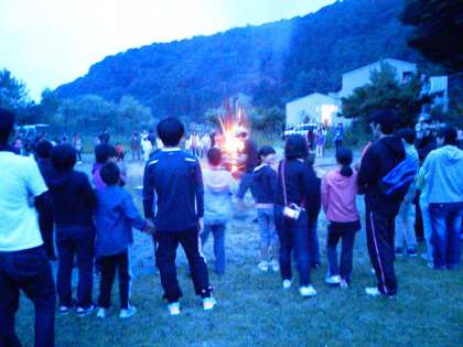 今夜のお楽しみは、キャンプファイヤ−です。大きな火を囲んで踊って歌って楽しみました。後は花火で盛り上がって、就寝準備を済ませて[おやすみなさい]です。