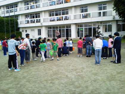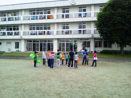 朝は曇り空。食事係りは仕事です。後の皆は朝会です。