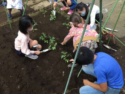 今日はトマトを大きめのポットや、畑への植えかえを行いました。明日にはトマトに名前も付けて、気持ちを込めて育てるようです。