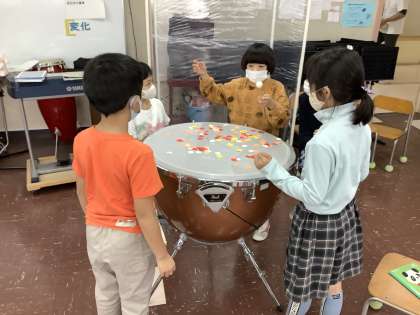 「太鼓をたたく強さによって、紙ふぶきの動き方が違いました。音が大きくなると、震えも大きくなるとわかりました。」としっかりと考察できました。