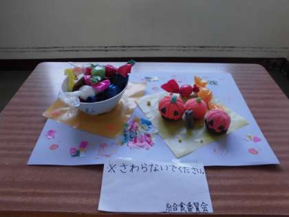 以前、給食委員会で作成した「十五夜」の飾りをご紹介しましたが、今月は「ハロウィン」の飾りを作って展示しています。