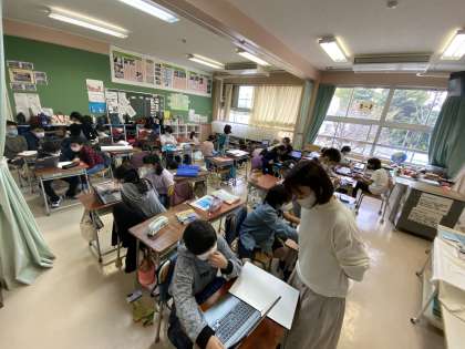 今日はICT支援員の方が来てくださっているので調べ方を聞きながら進めています。「雲の種類」「どうして虹はできるのか」「天使のはしごって何」「集中豪雨とゲリラ豪雨について」など、タブレットを駆使していました。