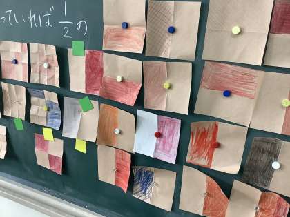 「おりがみの二分の一(1/2)のスペースに色を塗る」という課題です。