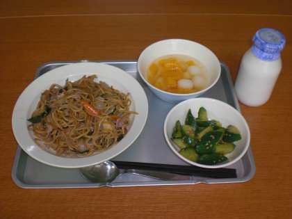 今日の給食は、塩焼きそば・きゅうりの中華味・フルーツ白玉・牛乳です。