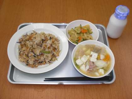 今日の給食は、五目ごはん・豚汁・シャキシャキ野菜・牛乳です。