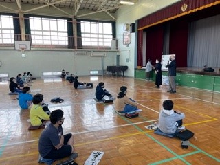 字の形を整えるためには、半紙と体の向き合わせ方、筆の動かし方など、子どもたちがわかりやすいように熱心に教えて下さいました。