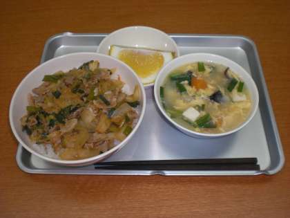今日の給食は、キムチ丼・にらたまスープ・牛乳・美生柑です。