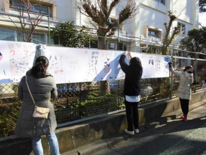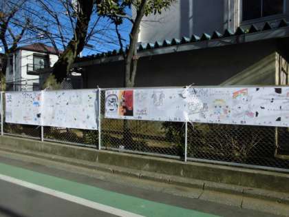 今年は商店街ではなく、学校の周囲のフェンスに掲示しています。