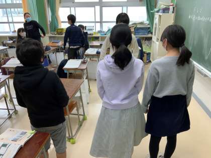 写真は、実際に自分たちを「ド」「レ」「ミ」がわりにして、並び方を試している様子です。頭で理解するだけではなく、目に見えるようにして確かめることで、実感をもちながら理解を深めていければと思います。