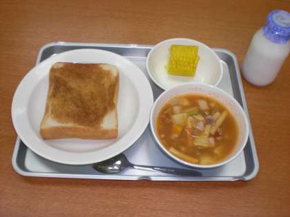 今日の給食は、シナモントースト・ミネストローネ・牛乳・蒸しとうもろこしです。