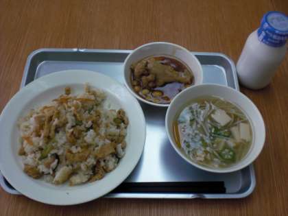 今日の給食は、子ぎつねごはん・七夕汁・大豆と手羽のやわらか煮・牛乳です。