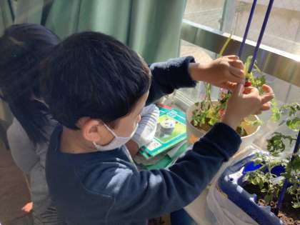 子どもたちが大切に室内で育てているので、赤くなるのがビニールハウスのトマトよりも早いようです。