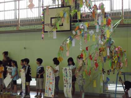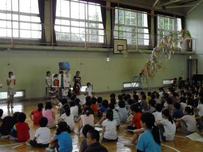 代表委員の児童が中心となって、七夕集会が行われました。織姫と彦星の物語や、七夕の歌、各クラスからの願い事の発表など、内容も盛りだくさんで、楽しい集会となりました。「大きな笹に飾られた子どもたちの願い事が、みんなかないますように!」