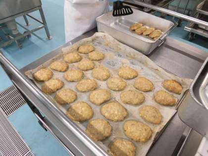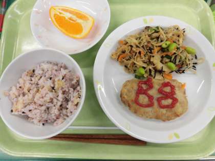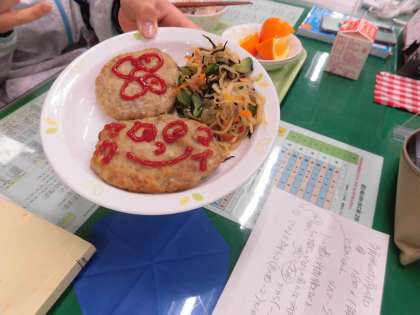 今日の給食は。開校記念日のお祝い給食です。ハンバーグにケチャップを使ってお祝いの言葉や絵を書きました。