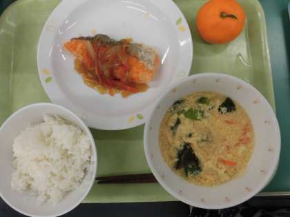さけのあまずあんかけは、サクサクにあげたさけに、たまねぎ、にんじん、ねぎが入ったあまずあんがたっぷりかかっています。